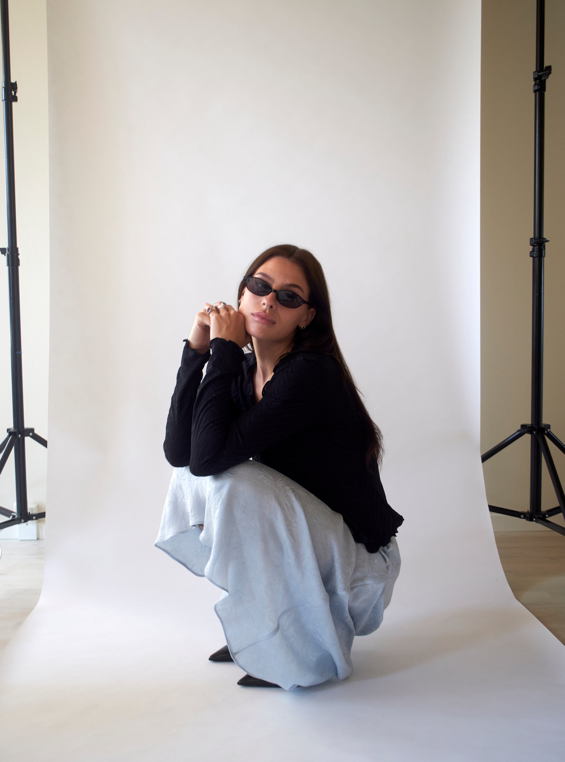 This skirt is made from dusty black lyocell - a fibre made from wood pulp. It feels and acts like soft silk, but is easier to maintain.