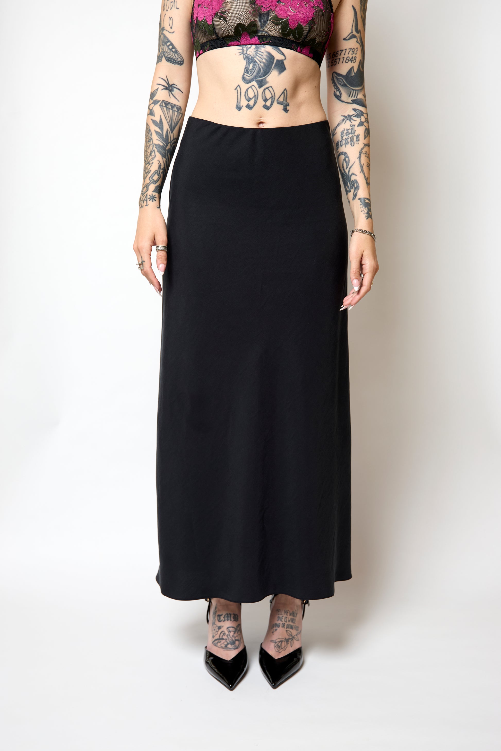 This skirt is made from dusty black lyocell - a fibre made from wood pulp. It feels and acts like soft silk, but is easier to maintain.